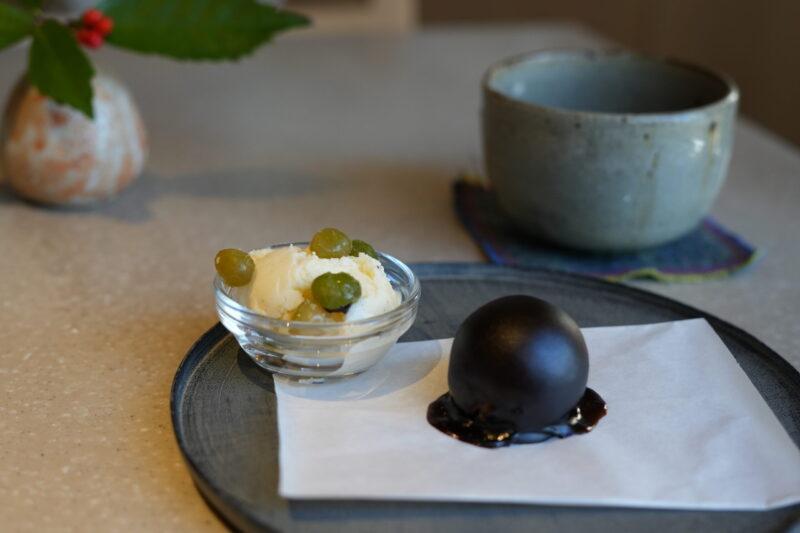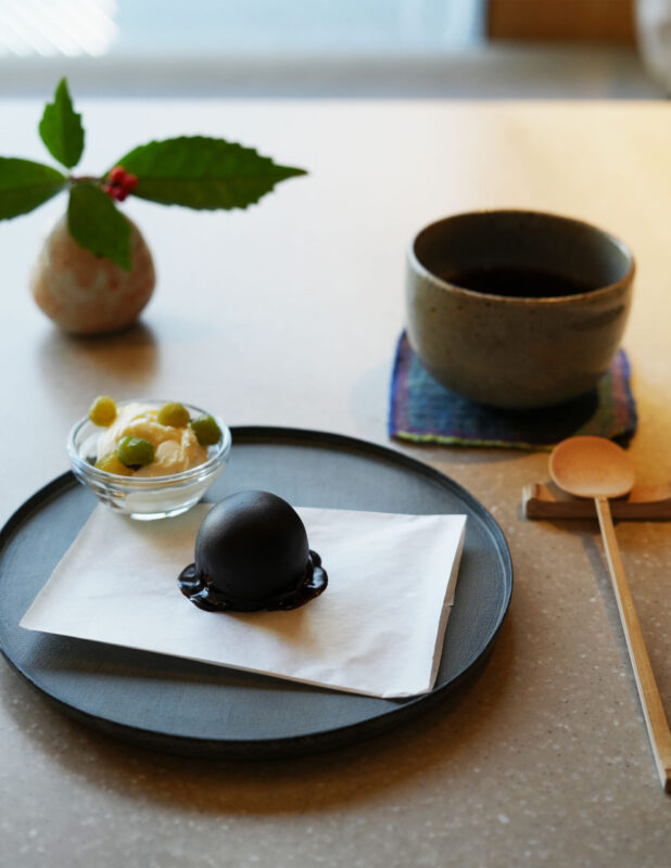 〈あたためたホクホクくろ玉&バニラアイスと青えんどう豆の鹿の子豆&あたたかいお飲み物〉付きの冬の特別メニューです。