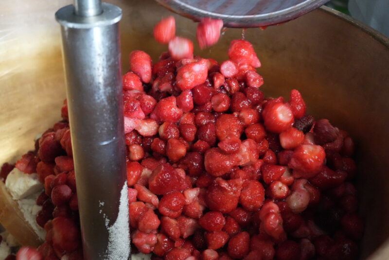 栽培されている14品種のいちごの中から、主に「よつぼし・ほしうらら・かおり野・やよいひめ・スターナイト・さやか・おいCベリー」などを中のあん、外側の羊羹にふんだんに使わせていただきました。